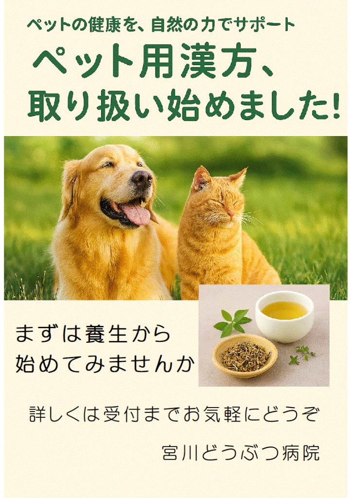 ペット用漢方の取り扱いについて お知らせ 2025年10月2日 このたび、ペット用漢方の取り扱いをはじめました。漢方は生薬のちからで、体質を整え、未然に不調を防ぐことを大切にしています。季節の変化や年齢、体質に合わせて無理なく体をサポートします。ただいま、当院かかりつけの飼い主様に取り扱い記念キャンペーンを行っております。詳しくは当院までお問い合わせください。
